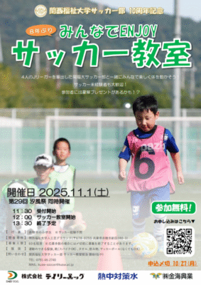 関西福祉大学【サッカー部】が、下記の日程で「みんなでENJOY サッカー教室」を開催いたします。