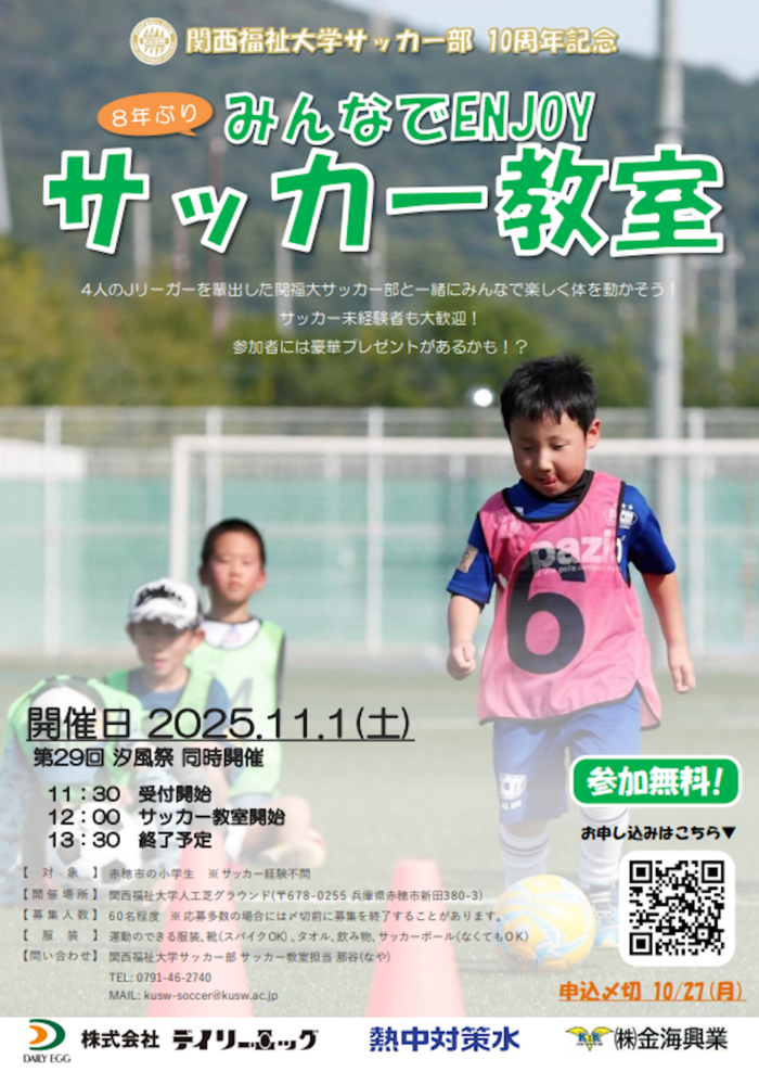 ・参加申し込み:お申し込みにつきましては、下記関西福祉大学みんなでENJOYサッカー教室2025申込フォームへのリンクよりお申し込み下さい。