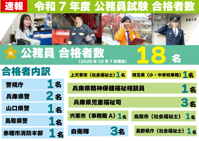 国立・公立病院、公務員、教員など幅広い分野での合格速報をお知らせいたします。