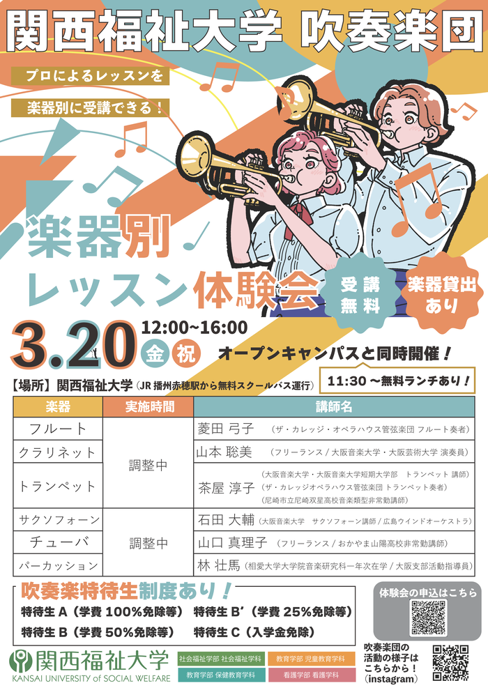 関西福祉大学【吹奏楽団】では、下記のとおり「楽器別レッスン体験会」を開催いたします。