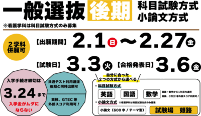 関西福祉大学では、下記の日程で一般選抜(後期)を実施いたします。