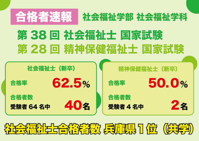 社会福祉士国家試験では、64名が受験し40名が合格、合格率は62.5%となり、全国平均の60.7%を上回る結果となりました。