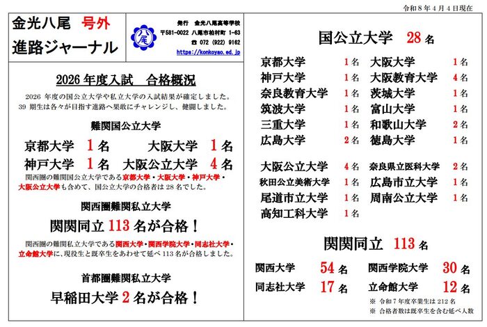 金光八尾高等学校では、2026年度入試における合格結果がまとまりましたので、ご報告いたします。